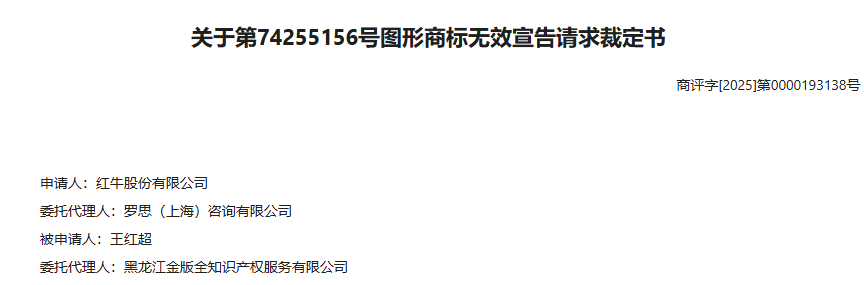 只不过,第74255156号图形商标已于2025年6月30日予以无效宣告了。猜得没错,无效宣告申请人正是红牛股份有限公司!可见,红牛公司已然开始维权行动了。