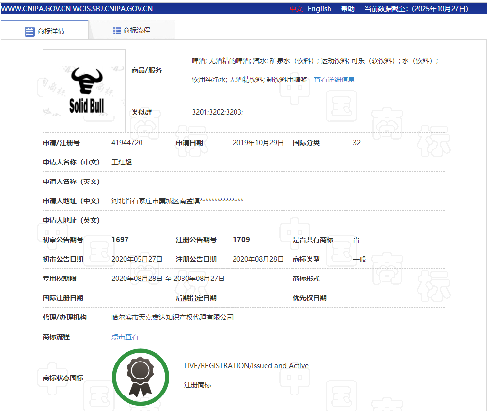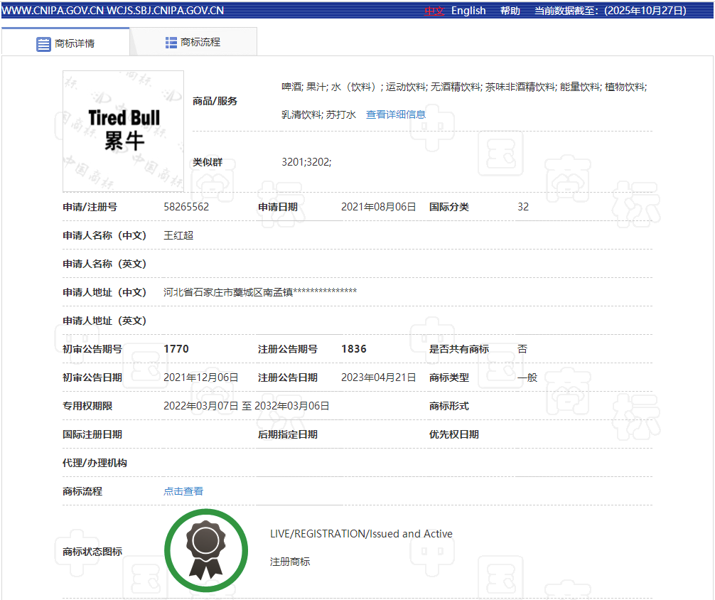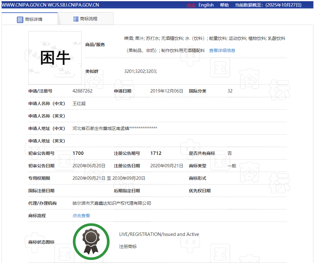 根据“困牛”饮料罐体上显示的商标注册号,小编在商标局官网上查了一下详情,居然都是注册商标!