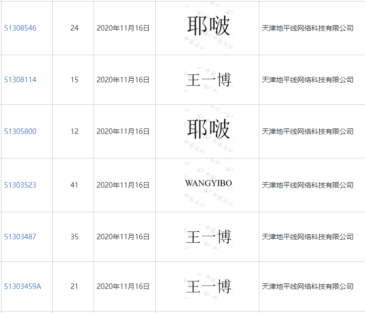 更值得关注的是,王一博持股70%的天津地平线网络科技有限公司已经申请注册了多枚“王一博”“耶啵”“WANGYIBO”商标,国际分类覆盖运输工具、灯具空调、乐器等多元化品类,且部分商标已经注册成功。