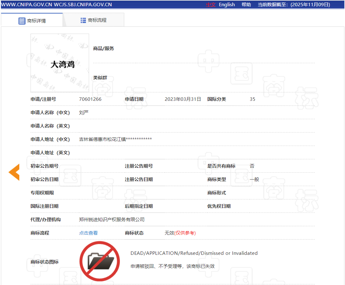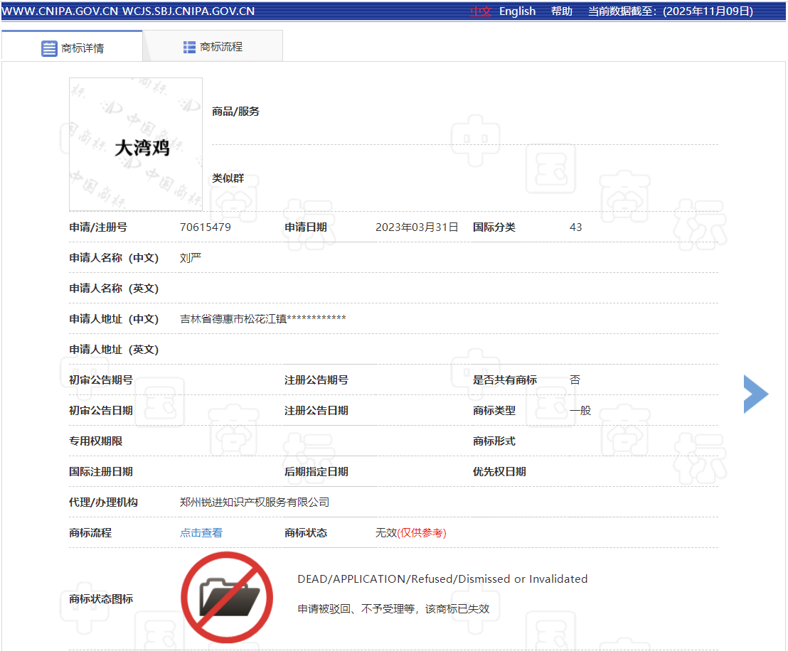 2023年3月31日,自然人“刘严”在第35、43类申请注册“大湾鸡”商标,但均被驳回。