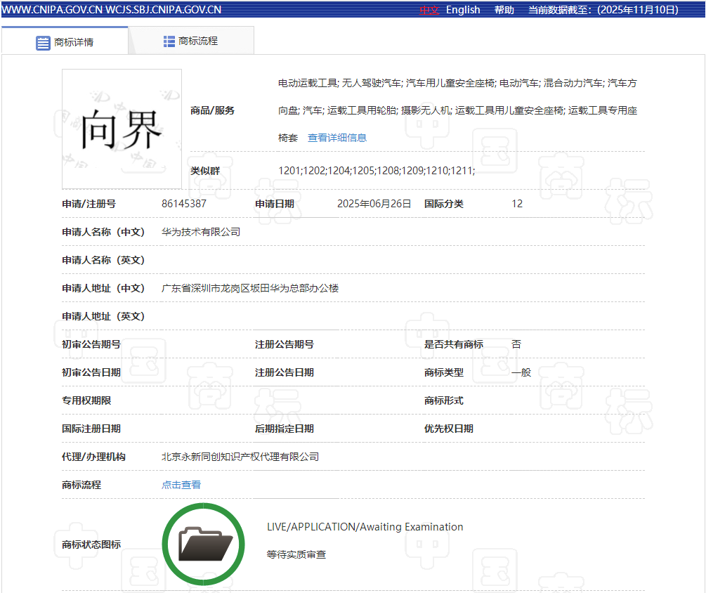 华为技术有限公司于2025年6月份集中申请注册了“向界”、“沛界”、“齐界”、“旺界”等一系列“界”字商标,这些商标的国际分类均涉及运输工具、科学仪器等,其中更明确包含无人驾驶汽车项目。目前,这些商标均处于实质审查阶段。