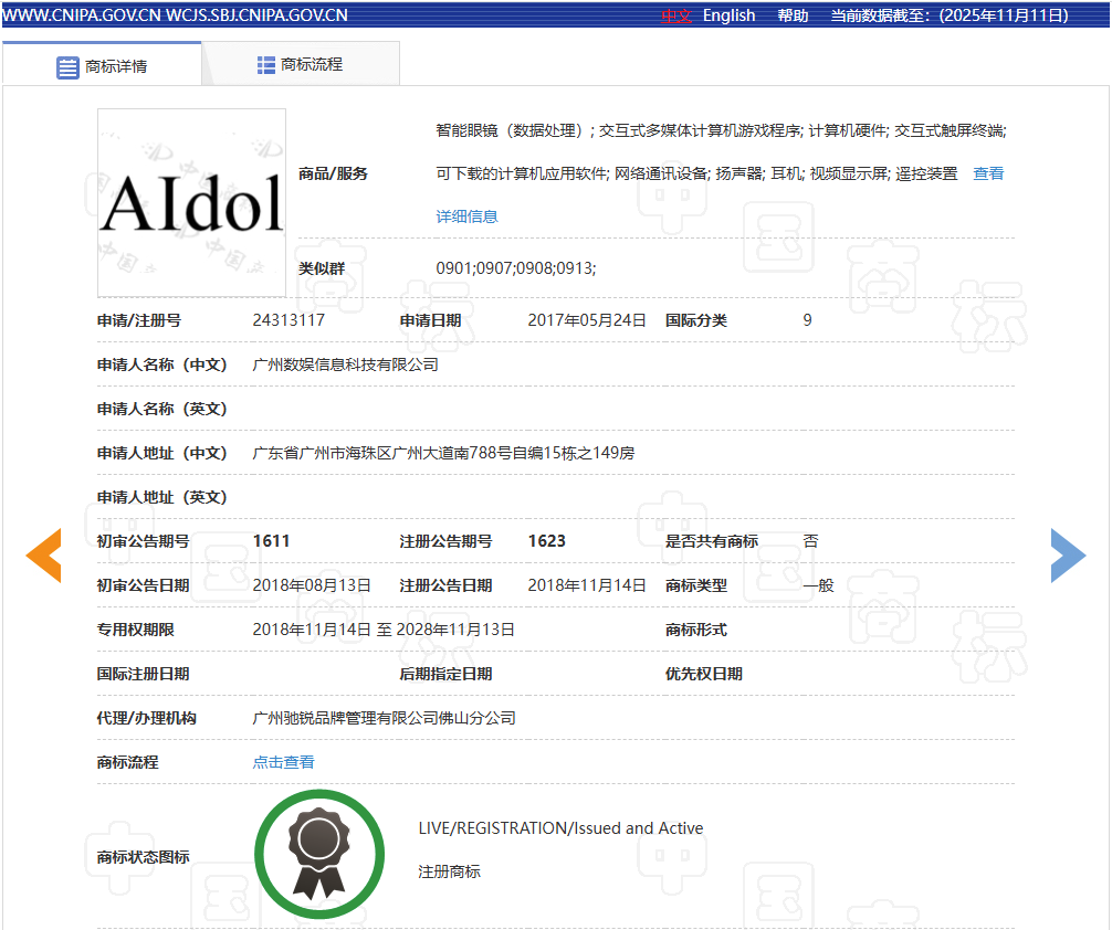 根据公开资料,“Aidol”商标由广州数娱信息科技有限公司于2017年5月24日申请,并于2018年11月14日成功注册公告,核定使用于第9类,其中包括计算机软件、机器人装置等商品。这意味着,在中国市场,这家中国公司才是“Aidol”商标在机器人等产品上的合法持有人。