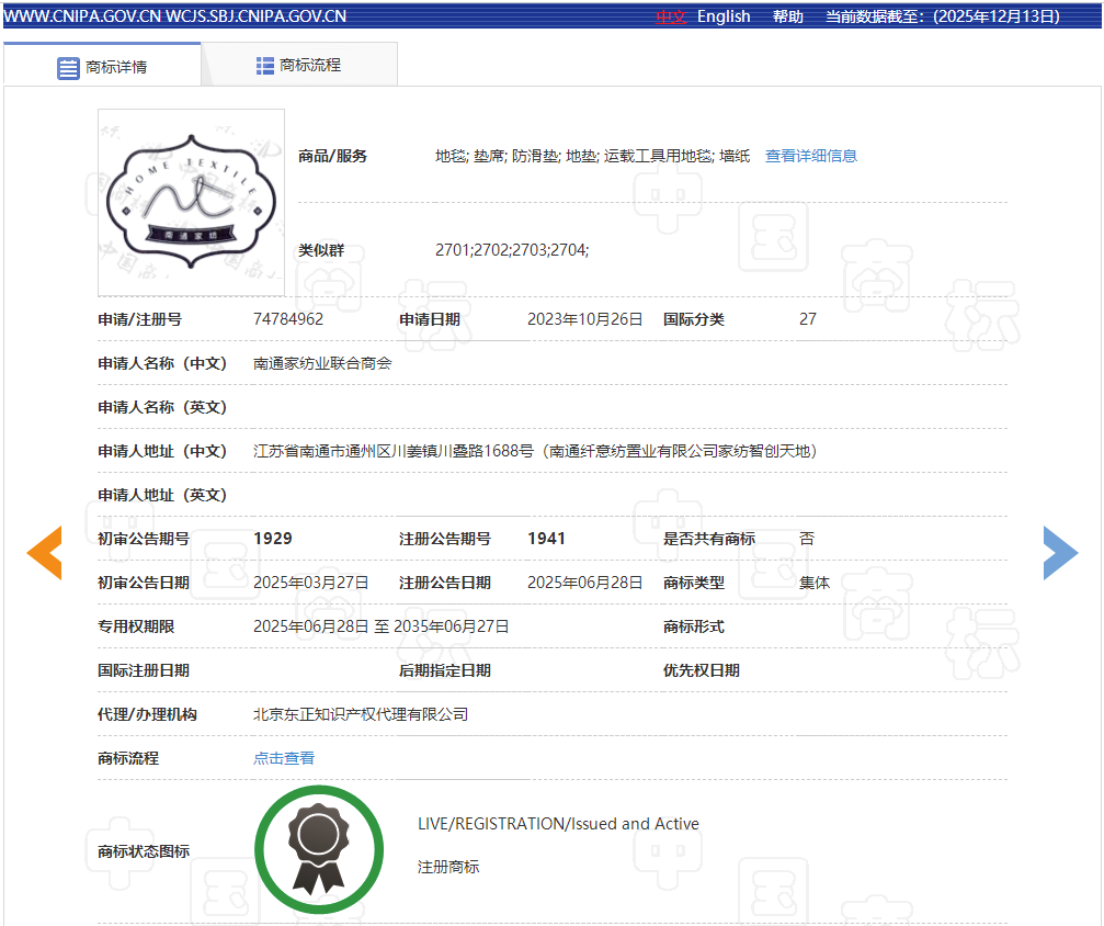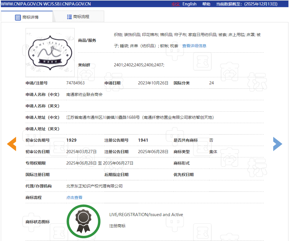 为助推产业从“量大”转向“质优”,在江苏南通国际家纺产业园区与南通市市场监管局的指导下,南通家纺业联合商会成功申请注册“南通家纺”集体商标,并于今年9月正式获国家知识产权局核准。