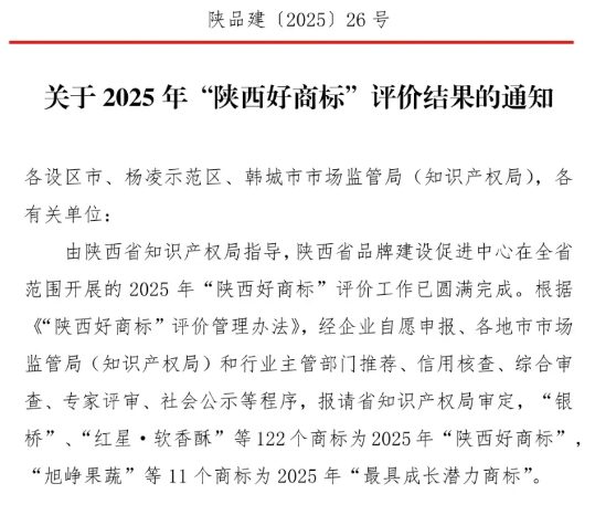 “陕西好商标”评选由陕西省知识产权局指导,经过企业申报、部门推荐、信用核查、专家评审等多重程序严格产生,代表了我省商标领域的较高荣誉。