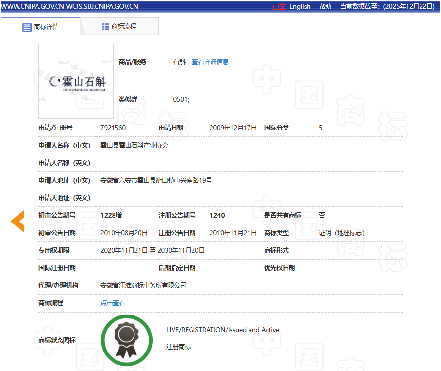 “霍山石斛”商标由霍山县霍山石斛产业协会持有,早在2010年就已注册为地理标志证明商标,成为标识霍山石斛产地与特色的重要标志。此次成功认定为驰名商标,标志着该品牌在法律保护上迈入了更高层次。