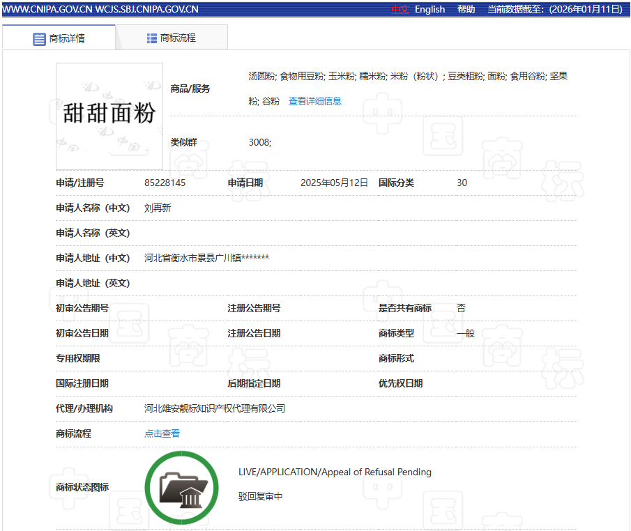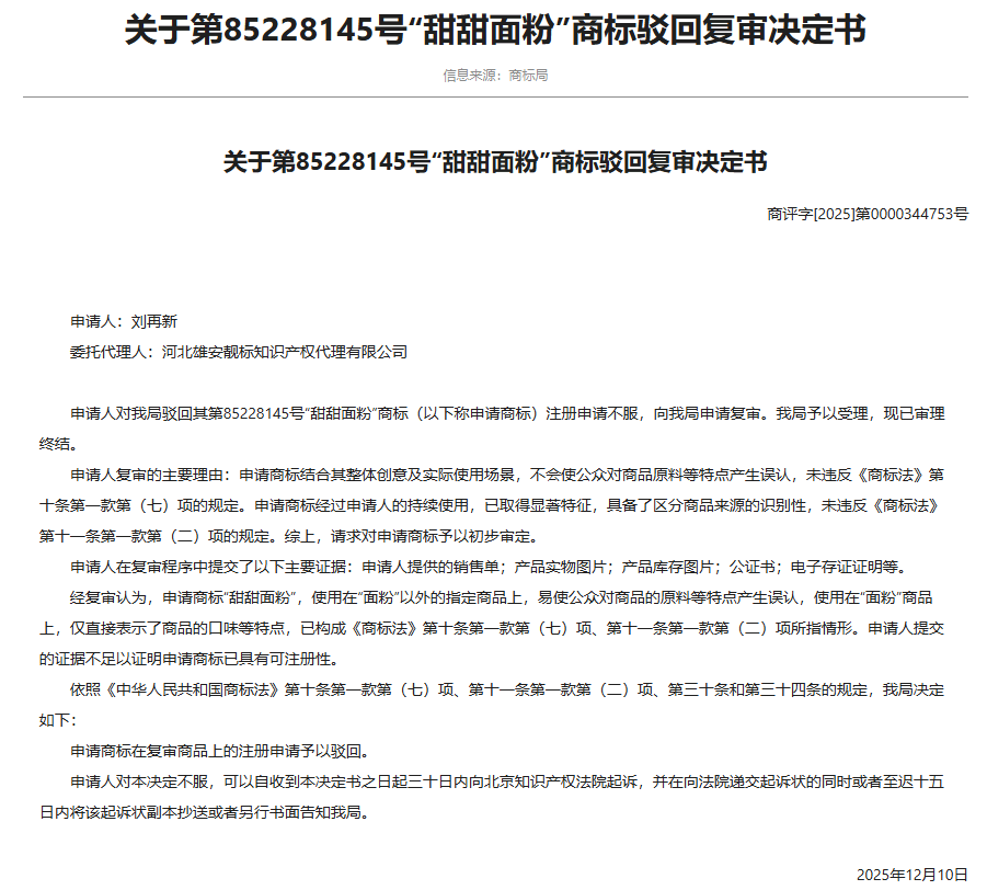 今年5月份,有人想申请注册“甜甜面粉”商标,却被驳回了。申请人不服,申请了驳回复审,结果依然予以驳回。为什么呢?