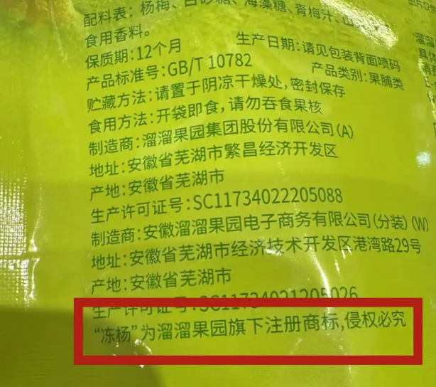 近日,有消费者发现,溜溜梅旗下的“冻杨梅”“真乌梅”产品,包装上突出显示的“冻杨”和“真乌”竟然是注册商标,而非对产品工艺或品种的实际描述。