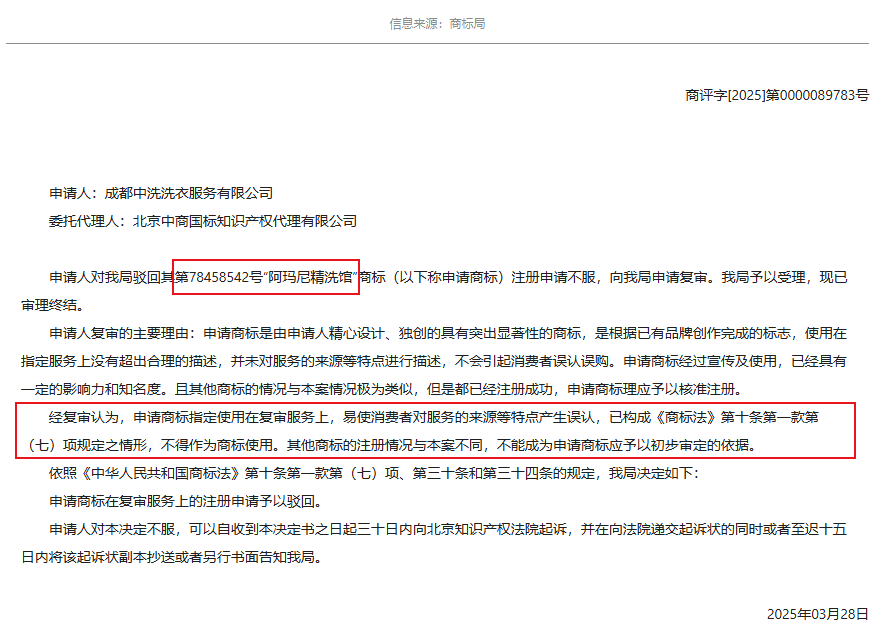 上述案例中,该商标申请人想蹭“阿玛尼”的品牌知名度,在37类“干洗、洗衣店服务、清洗衣服、洗烫衣服”等服务上申请注册“阿玛尼精洗馆”商标,被商标局以“易使消费者对服务的来源等特点产生误认”为由予以驳回。可见,傍名牌坚决不可取!
