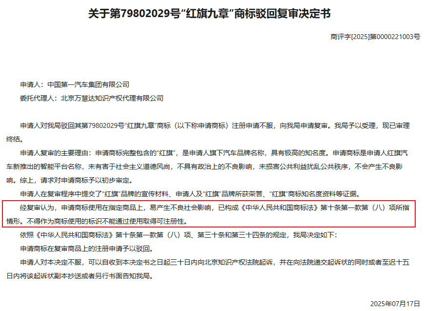 另外,中国第一汽车集团有限公司申请注册“红旗九章”都被驳回了,决定书中明确指出申请商标使用在指定商品上,易产生不良社会影响!